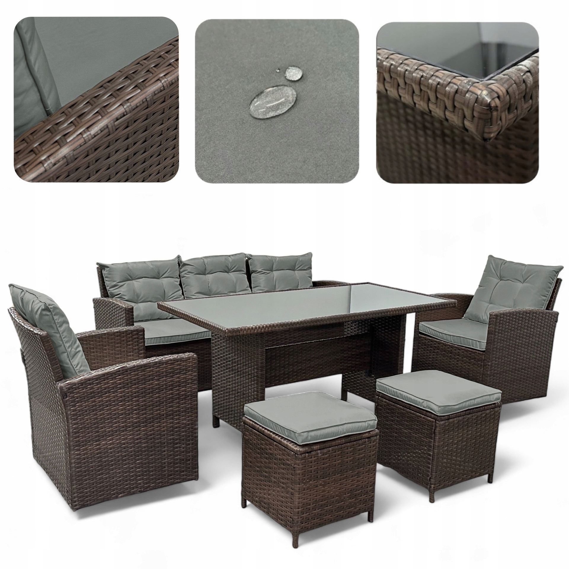 Wyjątkowa dbałość o detale, takie jak hydrofobowa powłoka tkanin oraz bezpieczny, wpuszczany blat z czarnego szkła, sprawia, że jest to inwestycja, która zachwyca stylem i trwałością przez wiele sezonów.